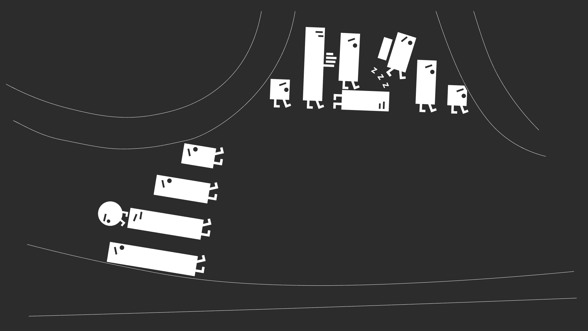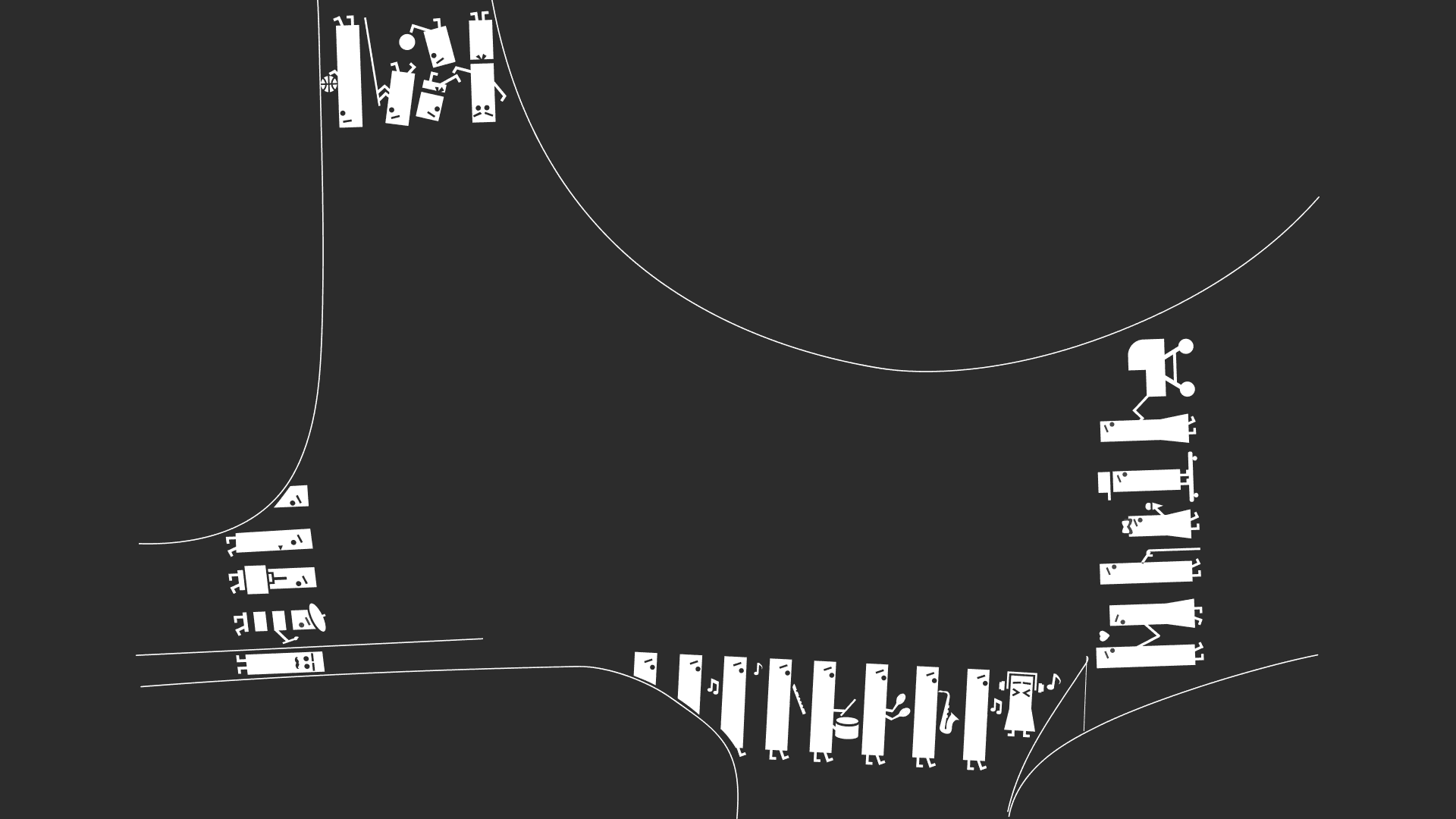 We chose the concept of skupnost (community) as the guiding theme. Using simple geometric forms—circle, triangle, and square—we developed illustrations that were easy to recognize as part of the crossings, while also carrying playful characterizations to make them more engaging. Each design connects the different crossings into a unified story, highlighting the variety of groups and individuals that form the fabric of Trnovo.